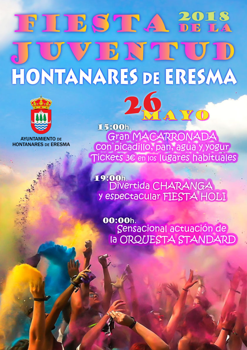 El próximo sábado 26 de mayo PROGRAMA 15:00h. Gran MACARRONADA con picadillo, pan, agua y yogur. Tickets 3€ en los lugares habituales 19:00h. Divertida CHARANGA y espectacular FIESTA HOLI 00:00h. Sensacional actuación de la ORQUESTA STANDARD