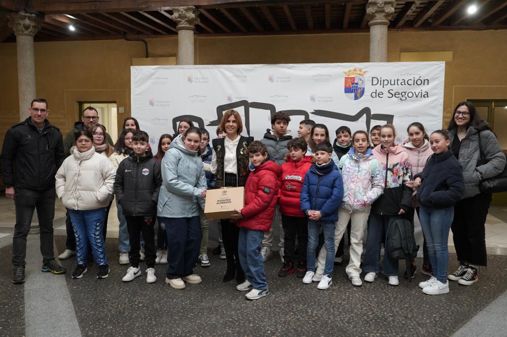 La vicepresidenta segunda y diputada del Área de Promoción Provincial y Desarrollo Rural Sostenible, Magdalena Rodríguez, ha entregado su premio a los alumnos de sexto curso de Educación Primaria del CEIP Elena Fortún, de la capital segoviana, como ganadores del concurso dirigido a colegios, que lanzaba la Diputación de Segovia durante el periodo navideño, con su Belén de Playmobil, como protagonista. El grupo de escolares al completo, acompañado por sus profesores, ha acudido al patio de columnas del Palacio Provincial para recibir una cesta de productos de Alimentos de Segovia.