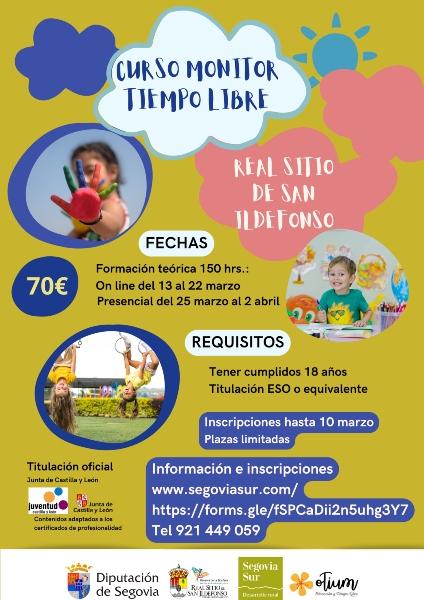 La Diputación Provincial de Segovia facilitará a los jóvenes de la provincia la obtención de la titulación de Monitor de Ocio y Tiempo libre, a través de la convocatoria de diferentes cursos que tendrán lugar a lo largo del año en varios municipios del territorio. Los tres primeros se celebrarán en Boceguillas, Cuéllar y el Real Sitio de San Ildefonso. Así, los jóvenes mayores de 18 años, que tengan el título de la E.S.O. o equivalente, pueden inscribirse para cursar estos talleres antes del 10 de marzo en el caso de que estén interesados en completarlos en Boceguillas o en el Real Sitio de San Ildefonso, y hasta el 8 de marzo en el caso de que sea en Cuéllar.