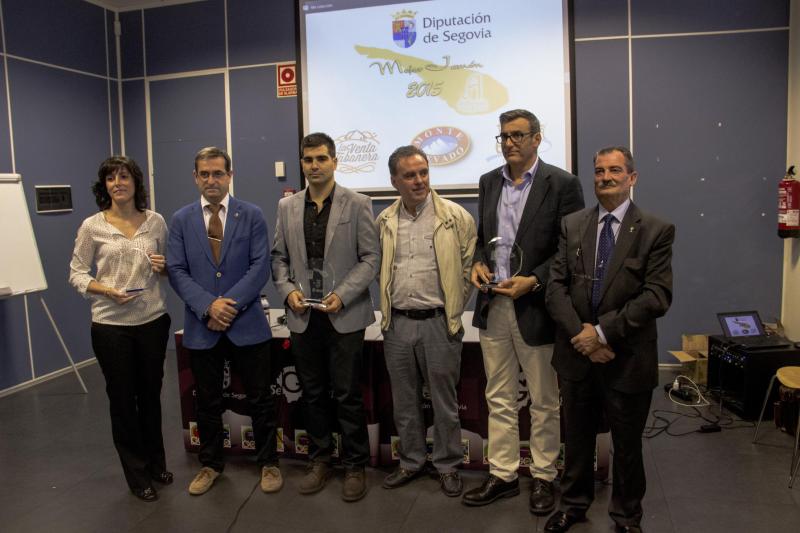 En la foto los representantes de las empresas galardonadas: en la categoría de blanco la Venta Tabanera, en ibérico de cebo Eresma de Coca y en ibérico de bellota Montenevado de Carbonero el Mayor, junto al diputado de Promoción Económica, Jaime Pérez, y el presidente de la Asociación de Camareros, Pablo Martín.