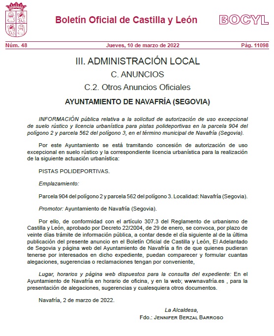 INFORMACIÓN pública relativa a la solicitud de autorización de uso excepcional de suelo rústico y licencia urbanística para pistas polideportivas en la parcela 904 del polígono 2 y parcela 562 del polígono 3, en el término municipal de Navafría (Segovia).
