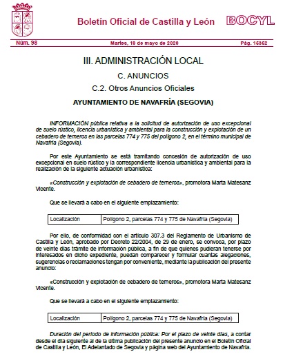INFORMACIÓN pública relativa a la solicitud de autorización de uso excepcional de suelo rústico, licencia urbanística y ambiental para la construcción y explotación de un cebadero de terneros en las parcelas 774 y 775 del polígono 2, en el término municipal de Navafría (Segovia).