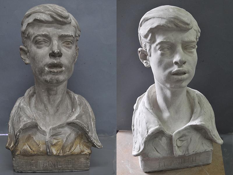 La Diputación de Segovia, en su labor de garantizar la conservación de su patrimonio artístico, ha encargado recientemente a la empresa segoviana ConservArte la limpieza y restauración de la pieza de yeso ‘Gitanillo’, de Florentino Trapero, que, al igual que la obra ‘Esclavo’ del escultor natural de Aguilafuente, forma parte de la colección privada de la institución provincial y había acusado el paso del tiempo.
