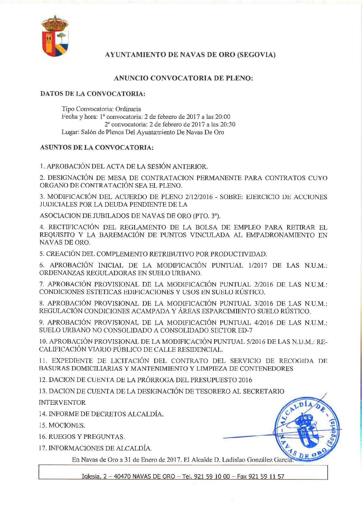 CONVOCATORIA SESIÓN ORDINARIA 2 DE FEBRERO DE 2017 PLENO ORDINARIO 2 DE FEBRERO DE 2017 SALÓN DE PLENOS DEL AYUNTAMIENTO 20:00 HORAS Documentos Convocatoria Pleno 02-02-2017.pdf (pdf 81,4 kB)