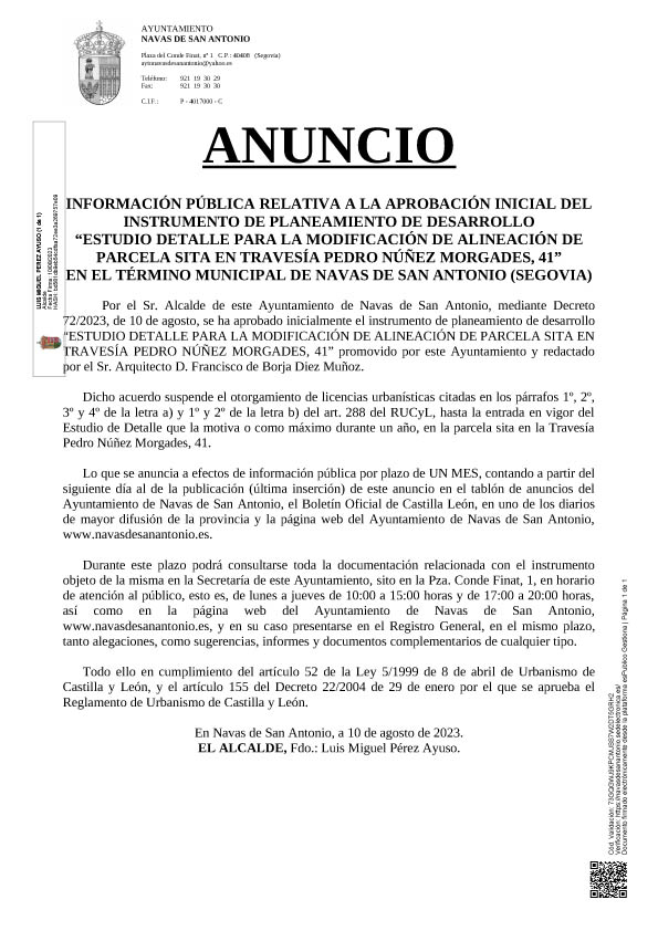 Información pública relativa a la aprobación inicial del “ESTUDIO DETALLE PARA LA MODIFICACIÓN DE ALINEACIÓN DE PARCELA SITA EN TRAVESÍA PEDRO NÚÑEZ MORGADES 41”.