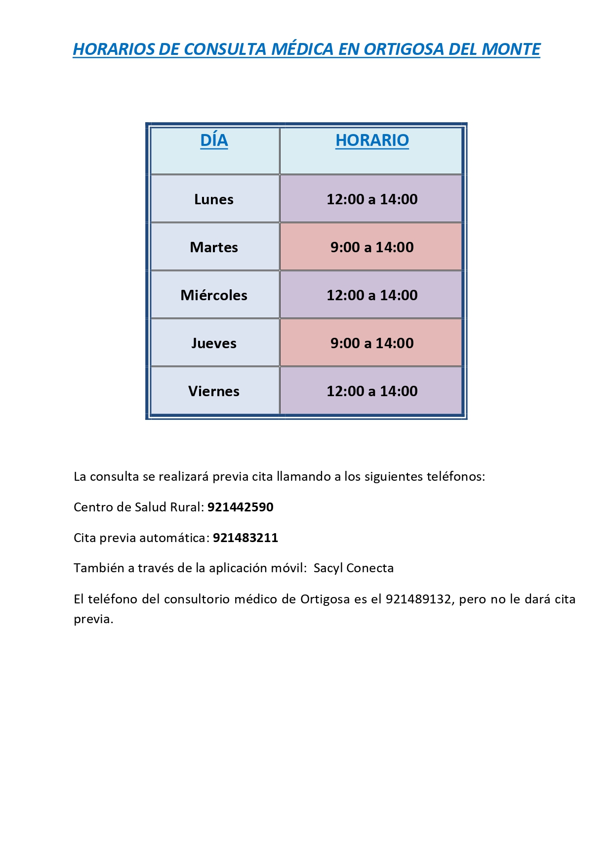 Se adjuntan los horarios de la Zona Básica de Salud Rural para toda la provincia de Segovia, sobre Medicina, Enfermería, Pediatría y otras prestaciones. En Ortigosa del Monte los horarios de...