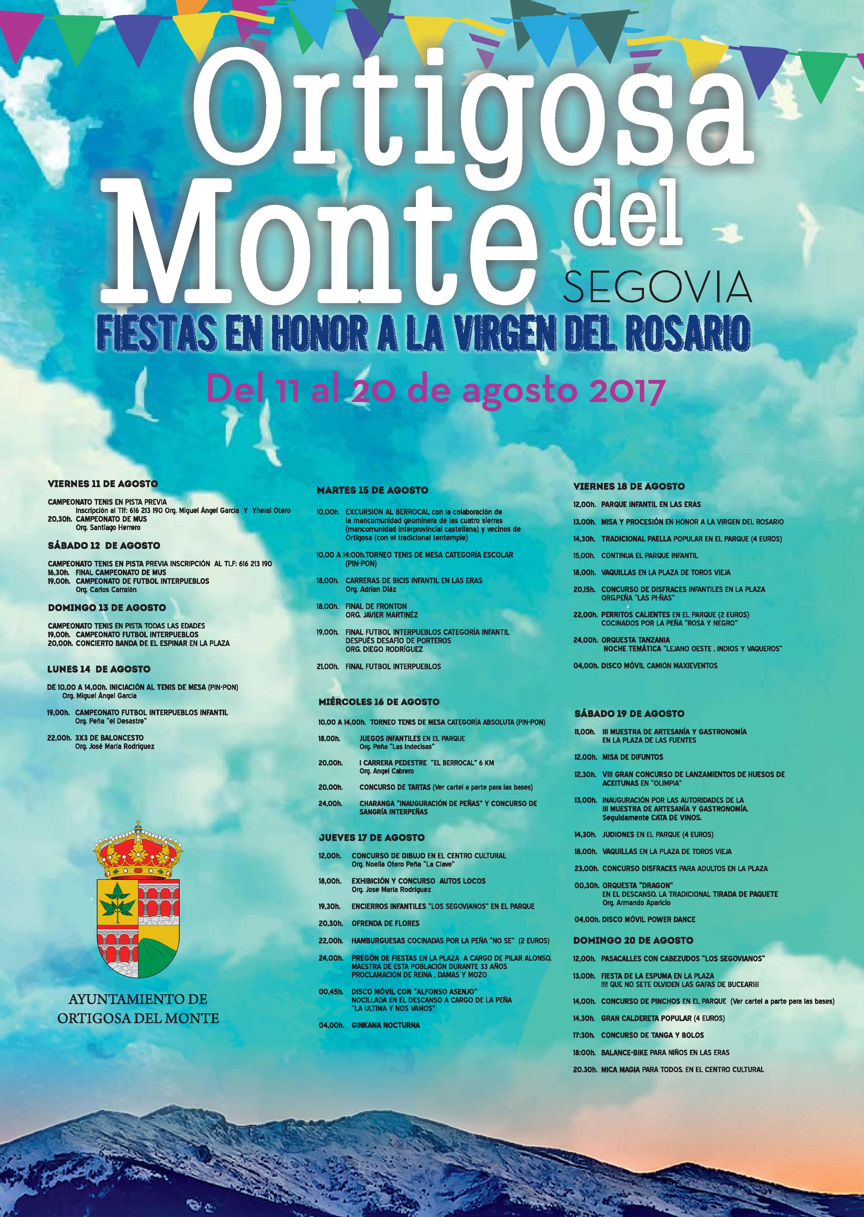 FIESTAS EN HONOR A NUESTRA SRA. DEL ROSARIO. AGOSTO 2017 Del 11al 20 de agosto. Programa de fiestas. Documentos programa ORTIGOSA DEL MONTE 2017.PDF (pdf 10,9 MB)CARTEL 2017 ORTIGOSA.jpg (jpg 1,2 MB)
