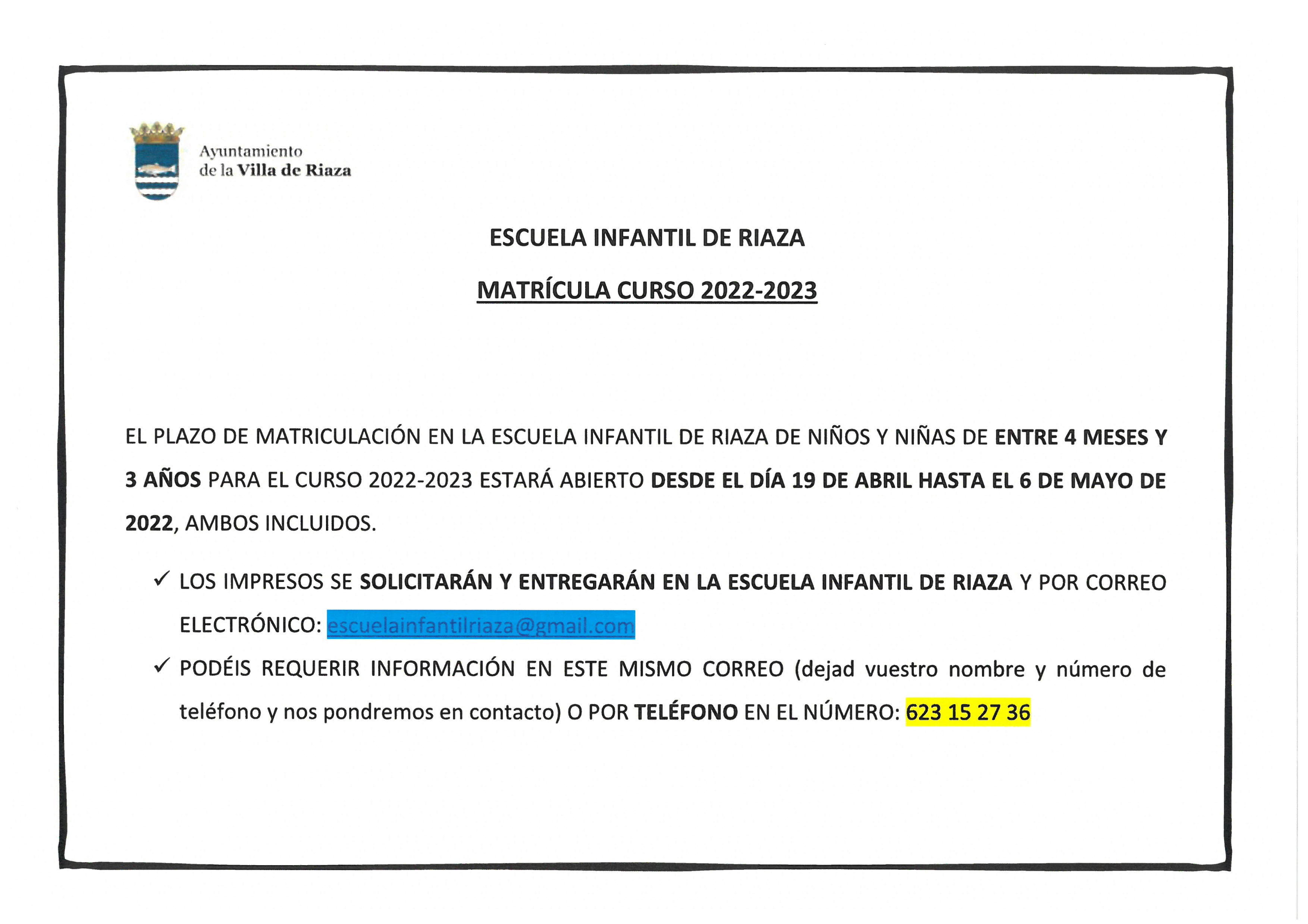 ESCUELA INFANTIL DE RIAZA. Matrícula Curso 2022/2023