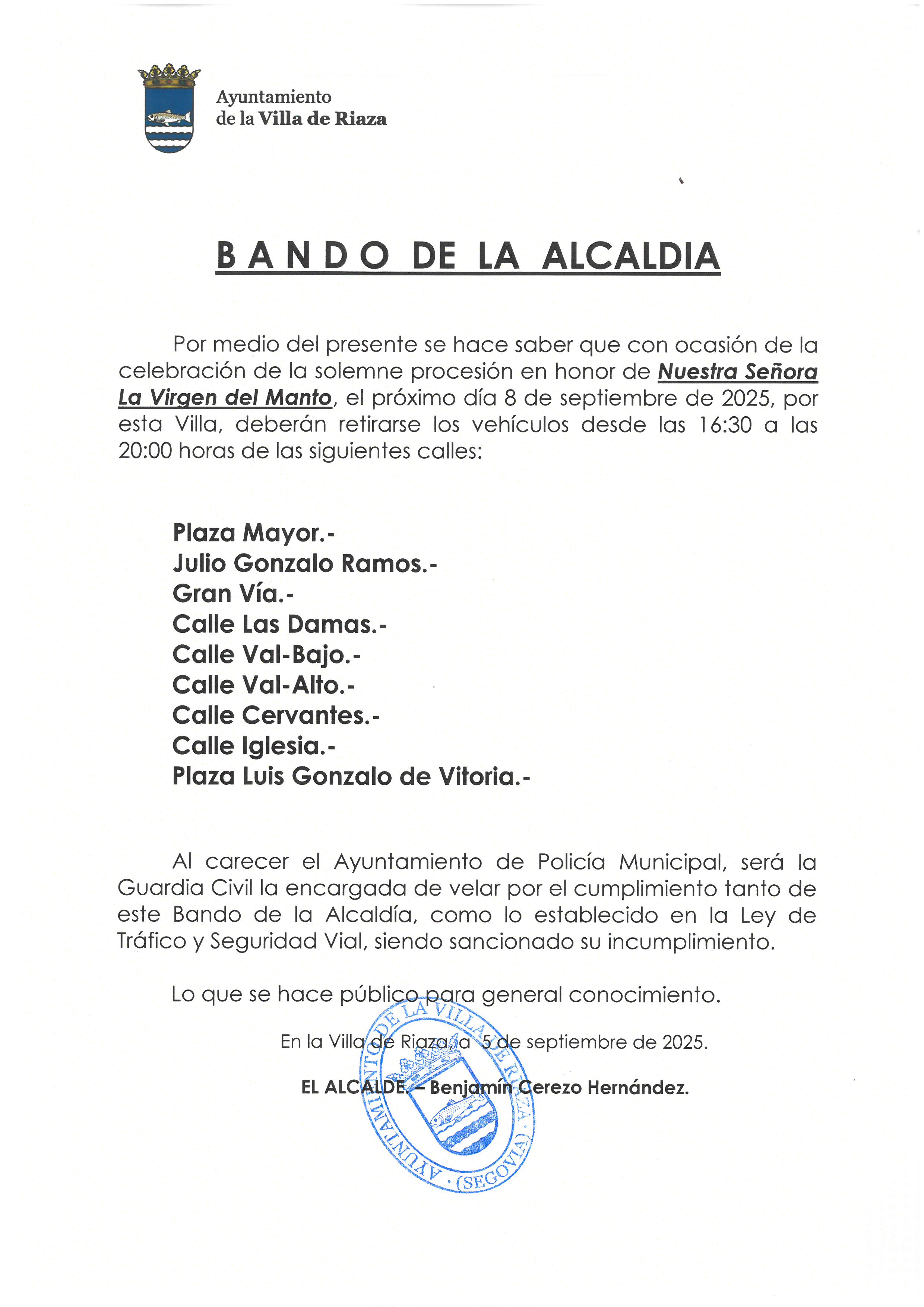 Por medio del presente se hace saber que con ocasión de la celebración de la solemne procesión en honor de Nuestra Señora La Virgen del Manto, el próximo día 8 de septiembre de 2025, por esta Villa, deberán retirarse los vehículos desde las 16:30 a las 20:00 horas de las siguientes calles: