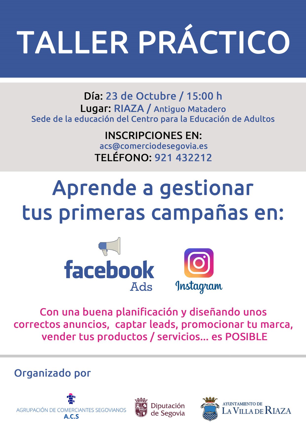 Aprende a gestionar tus primeras campañas en Facebook y en Instagram. 23 de octubre a las 15:00 horas en el Antiguo Matadero. Inscripciones en: acs@comerciodesegovia.es (921 43 22 12) o en el Ayuntamiento de Riaza.