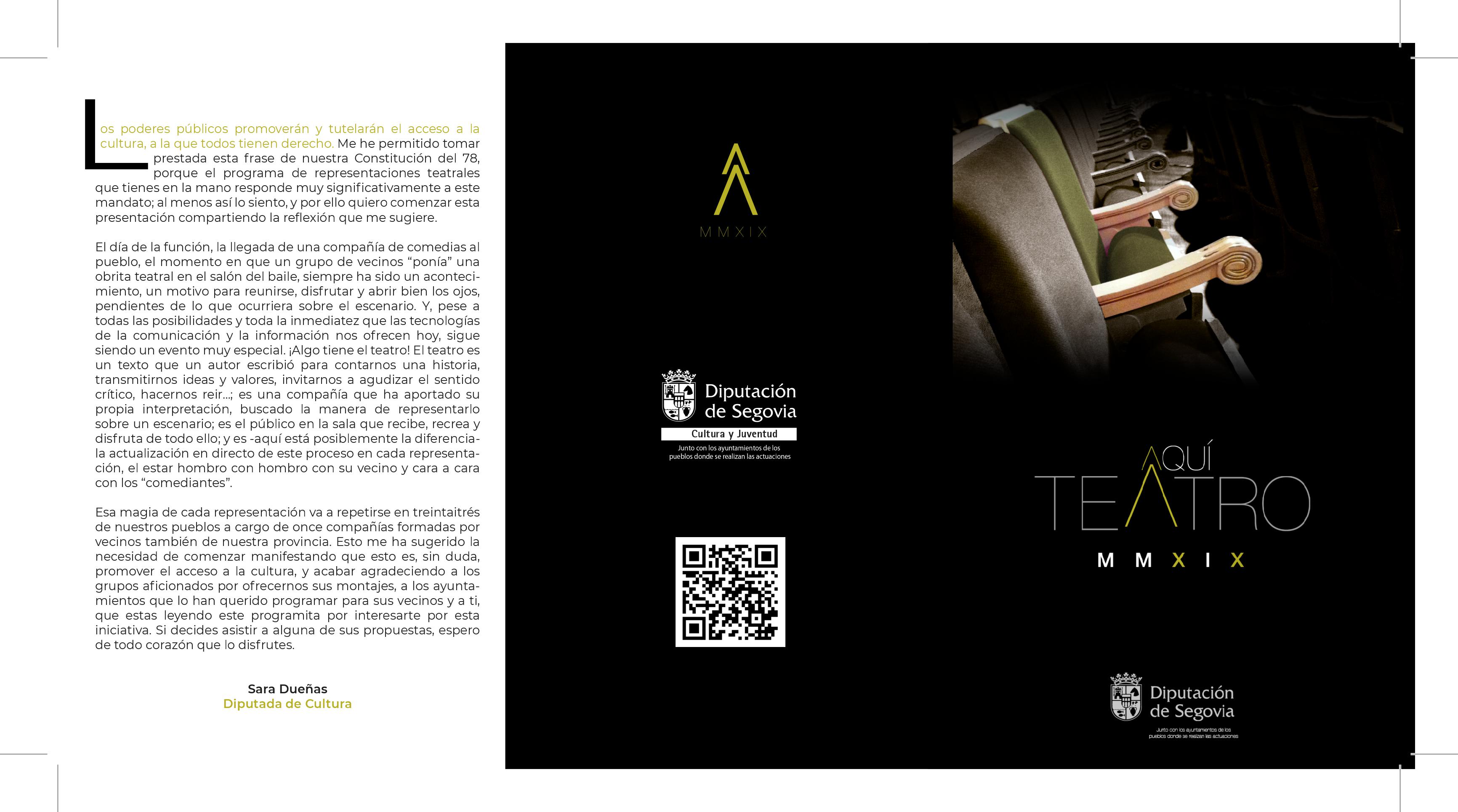 Como otras iniciativas culturales promocionadas desde la Diputación, ‘Aquí Teatro', que cuenta con un presupuesto de 11.480 euros aportado por la institución en materia de cachés —que se completa con otro porcentaje aportado por cada Ayuntamiento—, recibe un gran respaldo del público de la provincia, que encuentra en ella una inmejorable excusa para acomodarse de forma gratuita en una butaca y compartir con sus vecinos un rato, en el que siempre termina por haber alguien conocido sobre el escenario. Al mismo tiempo, las compañías teatrales aprovechan la oportunidad para que el trabajo que tanto esfuerzo y tiempo les lleva preparar pueda ser reconocido el mayor número de funciones posible.