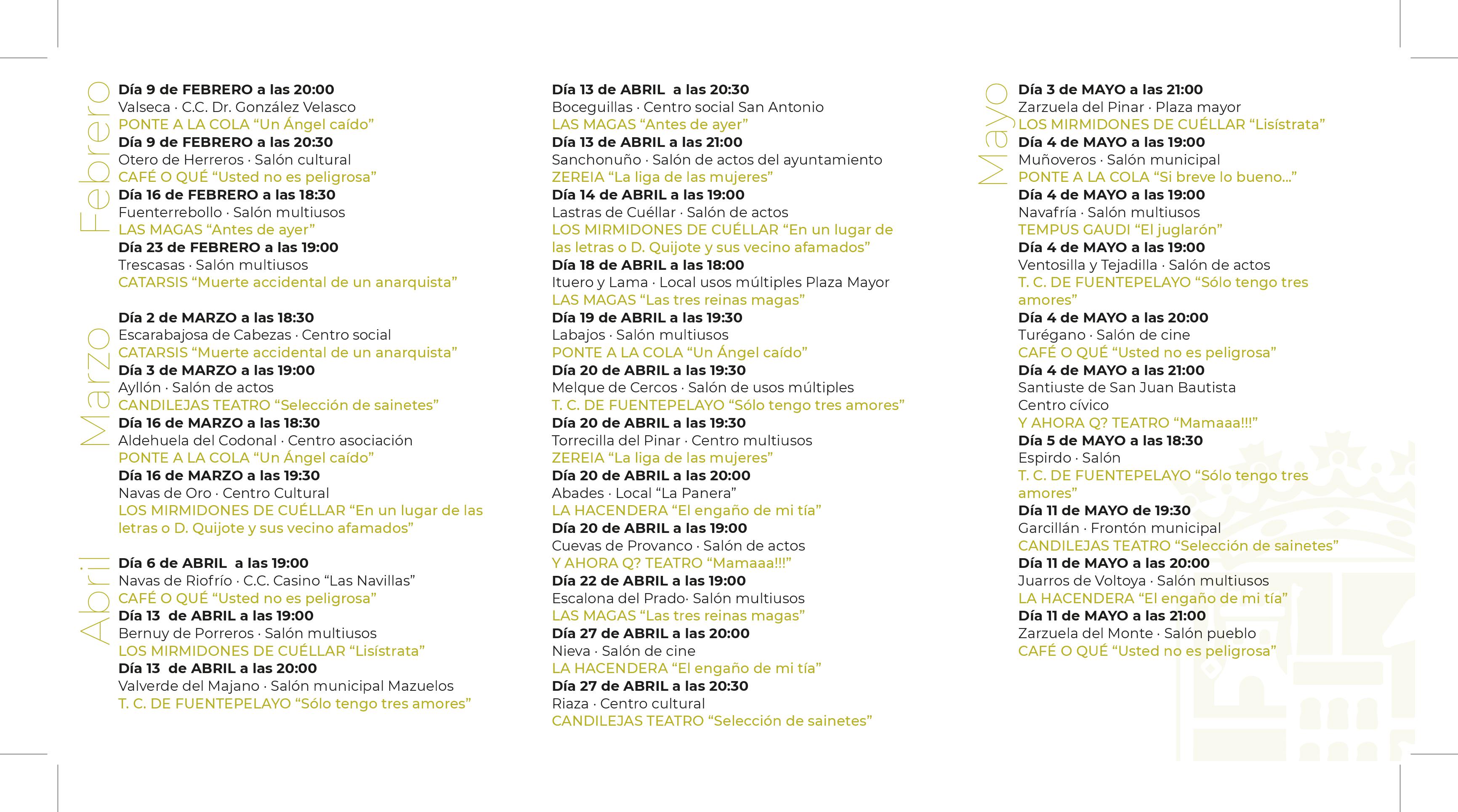 En total serán treinta y tres los municipios que acojan alguna de estas representaciones, que comenzarán el próximo sábado, 9 de febrero, en Valseca y Otero de Herreros con las actuaciones de Ponte a la cola y Café o Qué respectivamente, y se extenderán hasta el 11 de mayo, cuando la misma Café o Qué, La Hacendera y Candilejas Teatro visiten Zarzuela del Monte, Juarros de Voltoya y Garcillán.