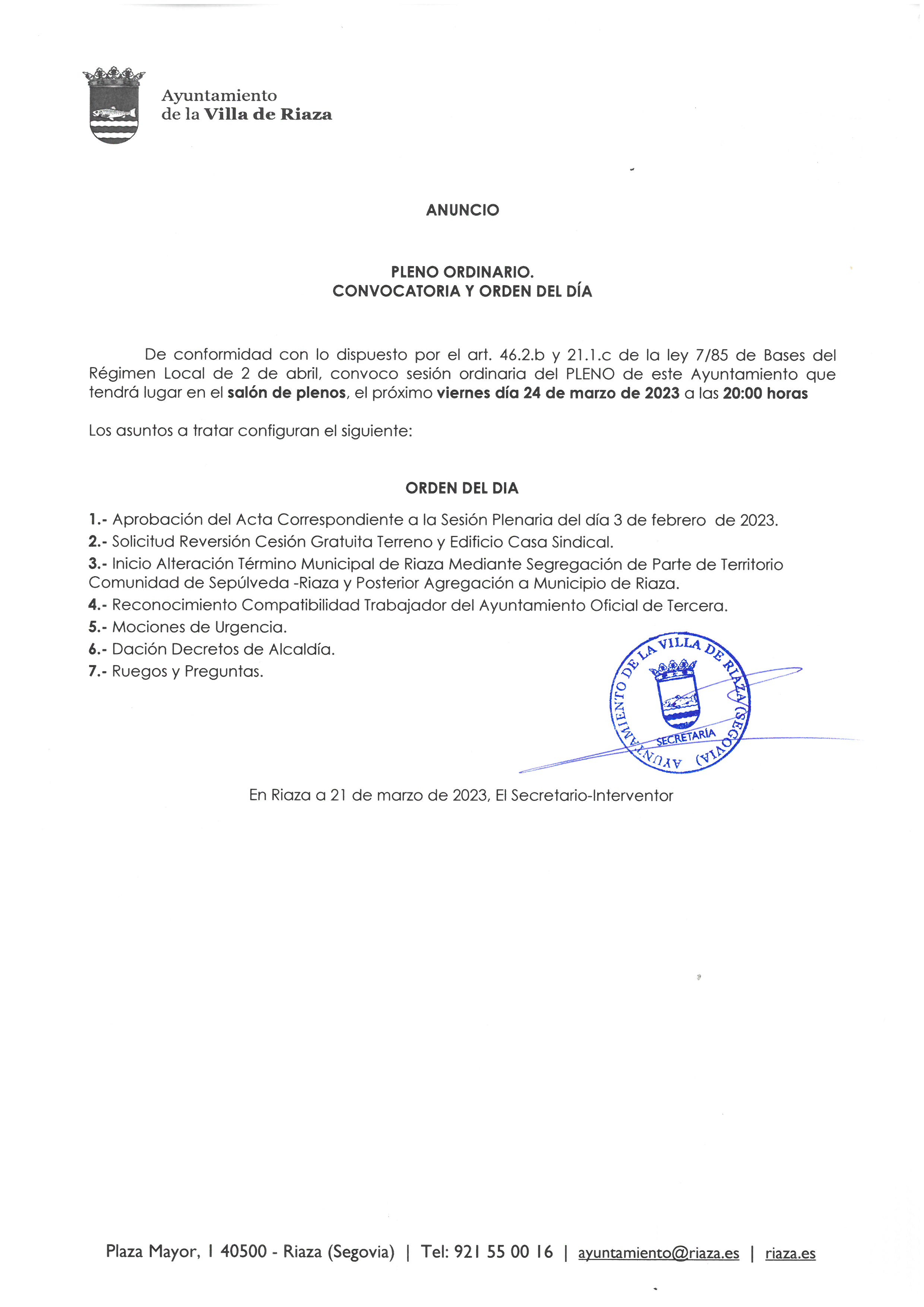 En Riaza a 21 de marzo de 2023, El Secretario-Interventor