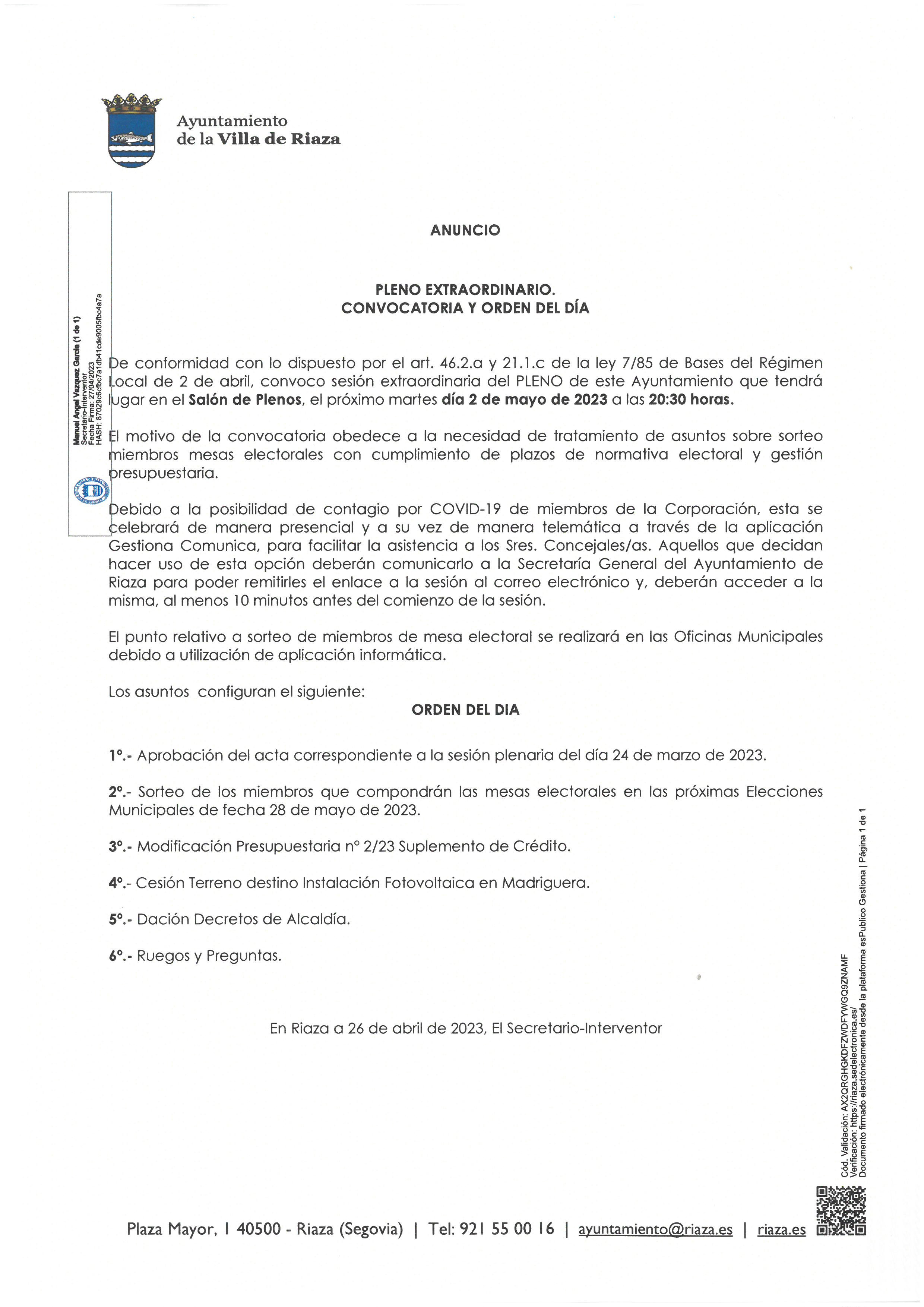 De conformidad con lo dispuesto por el art. 46.2.a y 21.1.c de la ley 7/85 de Bases del Régimen Local de 2 de abril, convoco sesión extraordinaria del PLENO de este Ayuntamiento que tendrá lugar en el Salón de Plenos, el próximo martes día 2 de mayo de 2023 a las 20:30 horas.