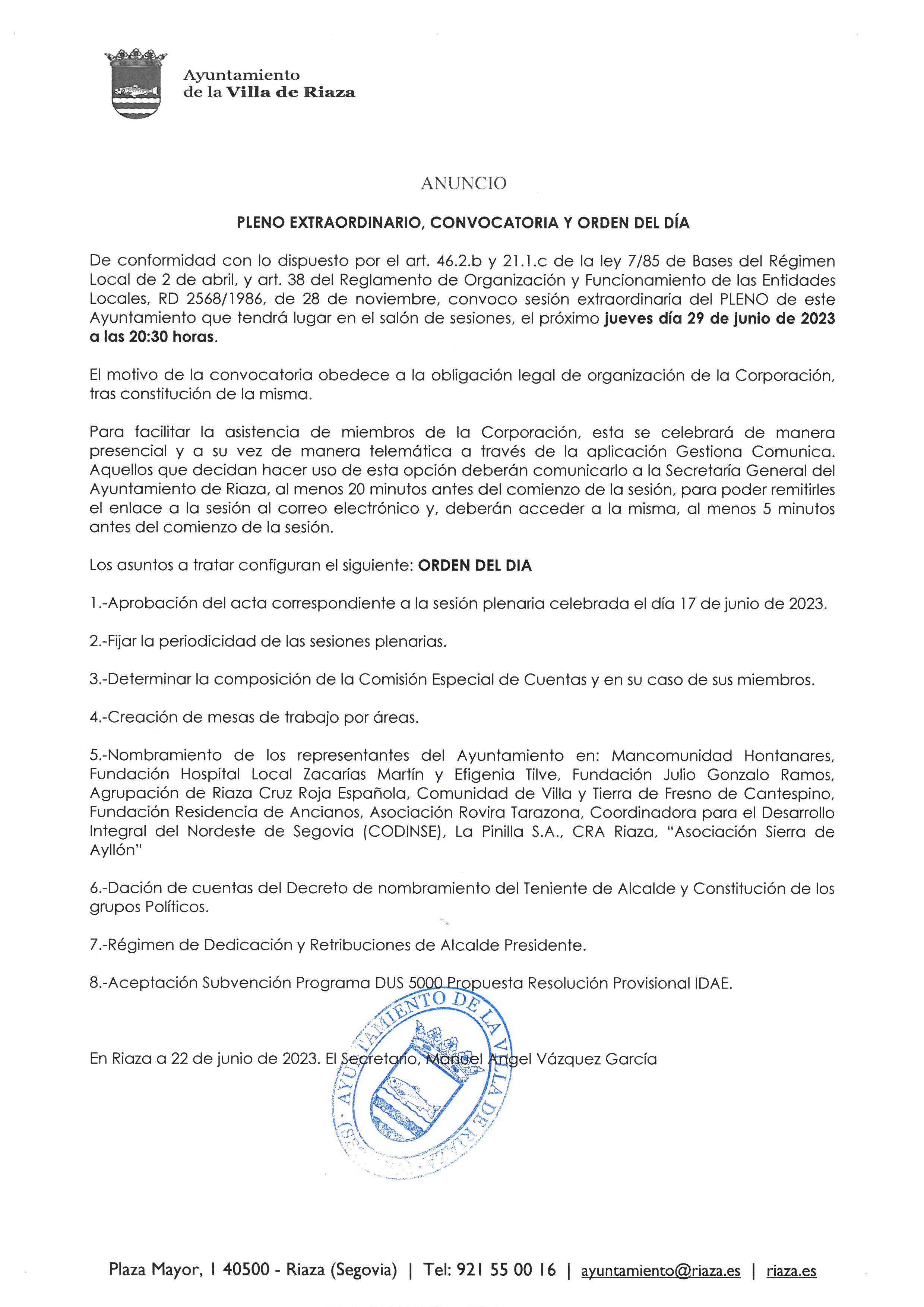 En Riaza a 22 de junio de 2023. El Secretario, Manuel Angel Vázquez García