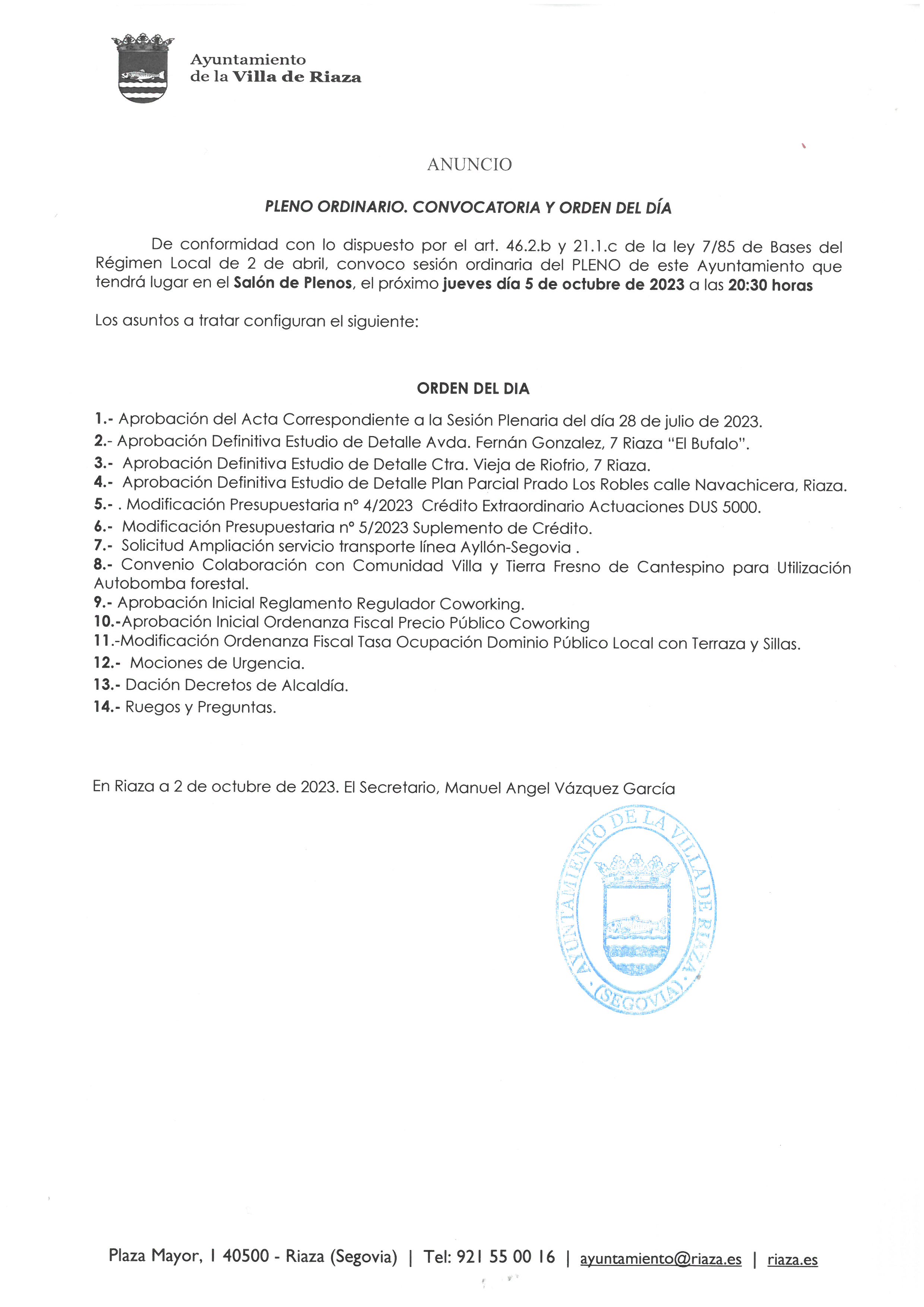 De conformidad con lo dispuesto por el art. 46.2.b y 21.1.c de la ley 7/85 de Bases del Régimen Local de 2 de abril, convoco sesión ordinaria del PLENO de este Ayuntamiento que tendrá lugar en el Salón de Plenos, el próximo jueves día 5 de octubre de 2023 a las 20:30 horas