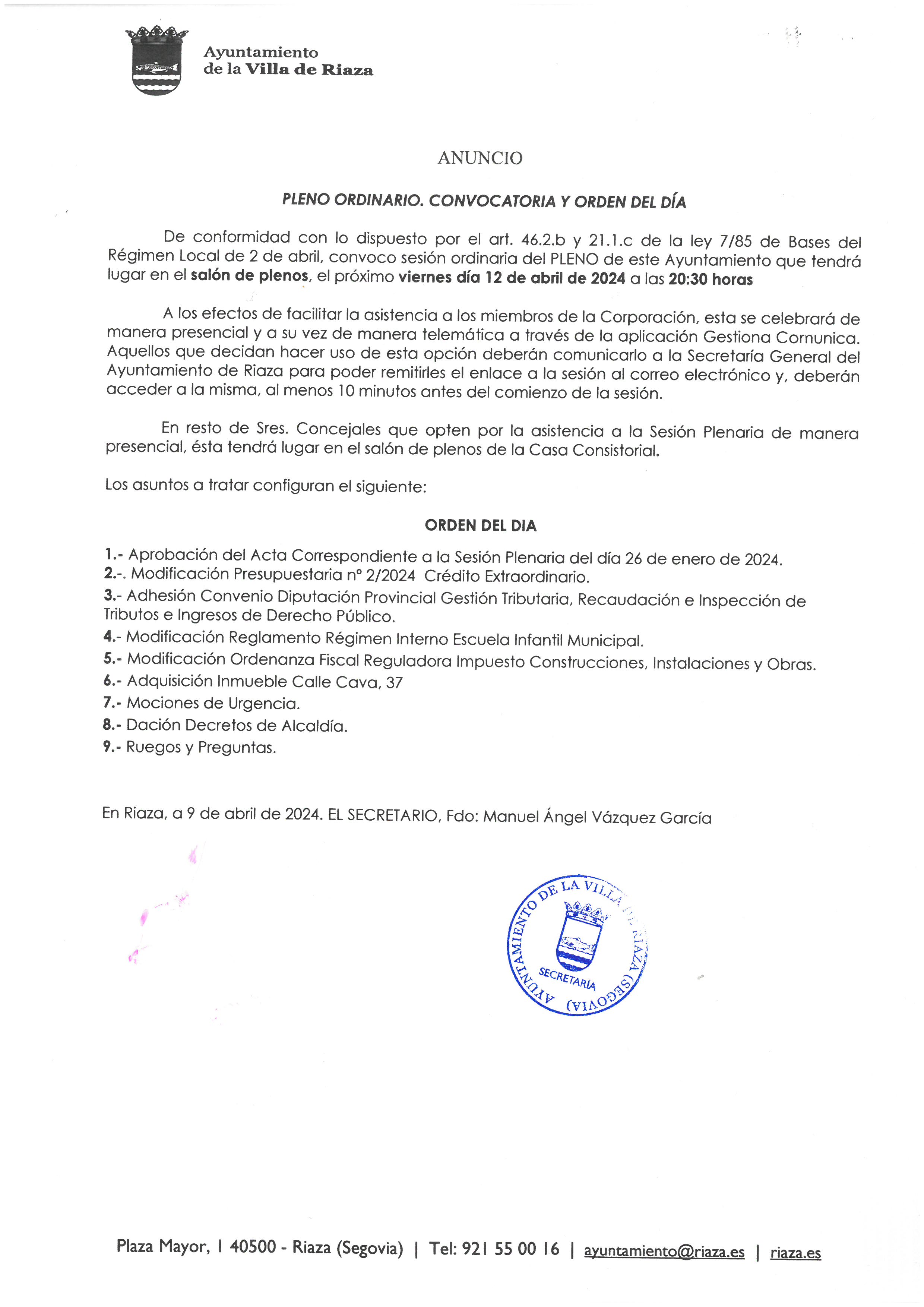A los efectos de facilitar la asistencia a los miembros de la Corporación, esta se celebrará de manera presencial y a su vez de manera telemática a través de la aplicación Gestiona Comunica. Aquellos que decidan hacer uso de esta opción deberán comunicarlo a la Secretaría General del Ayuntamiento de Riaza para poder remitirles el enlace a la sesión al correo electrónico y, deberán acceder a la misma, al menos 10 minutos antes del comienzo de la sesión.
