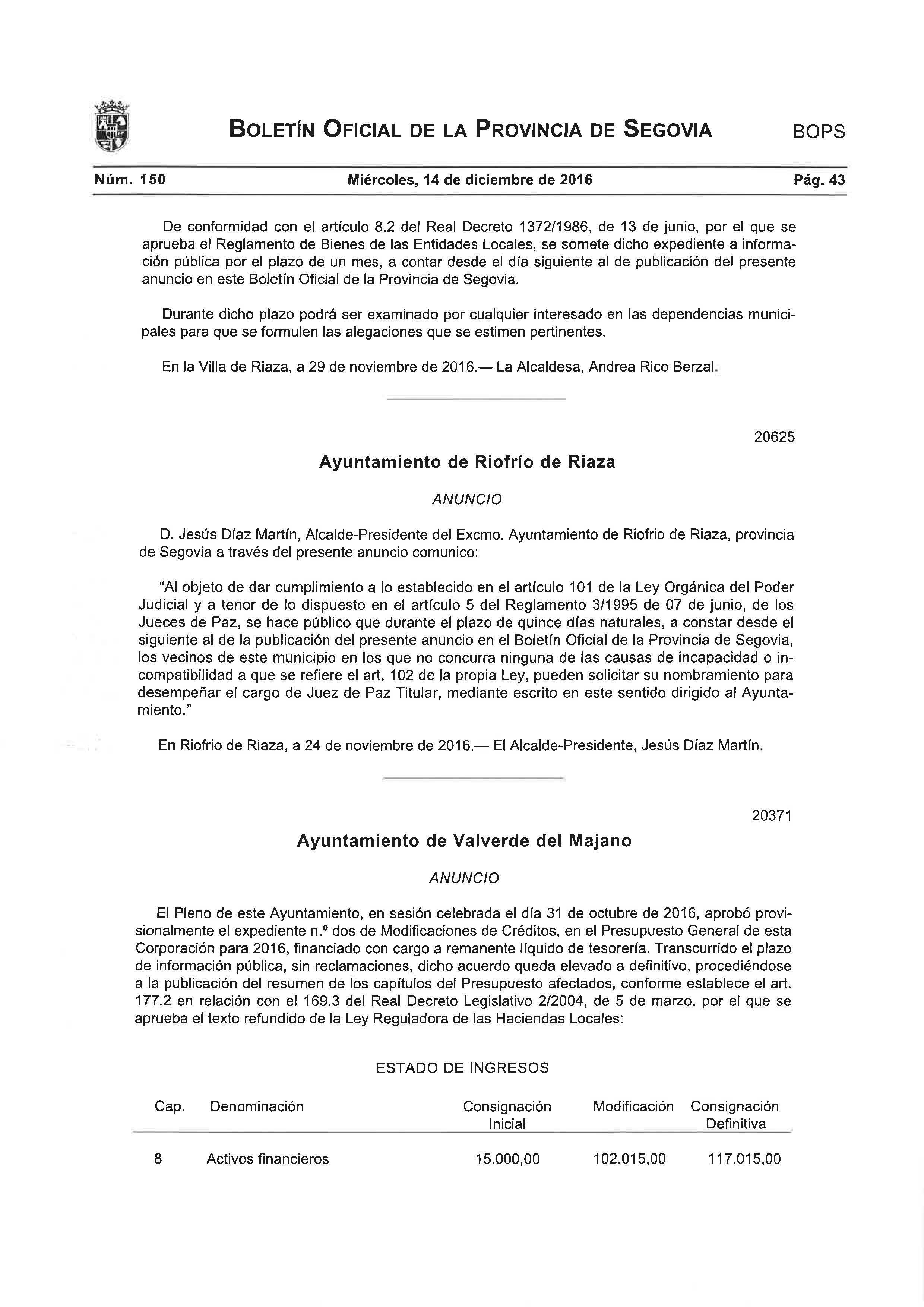 D. Jesús Díaz Martín, Alcalde-Presidente del Excmo. Ayuntamiento de Riofrio de Riaza, provincia de Segovia a través del presente anuncio comunico: