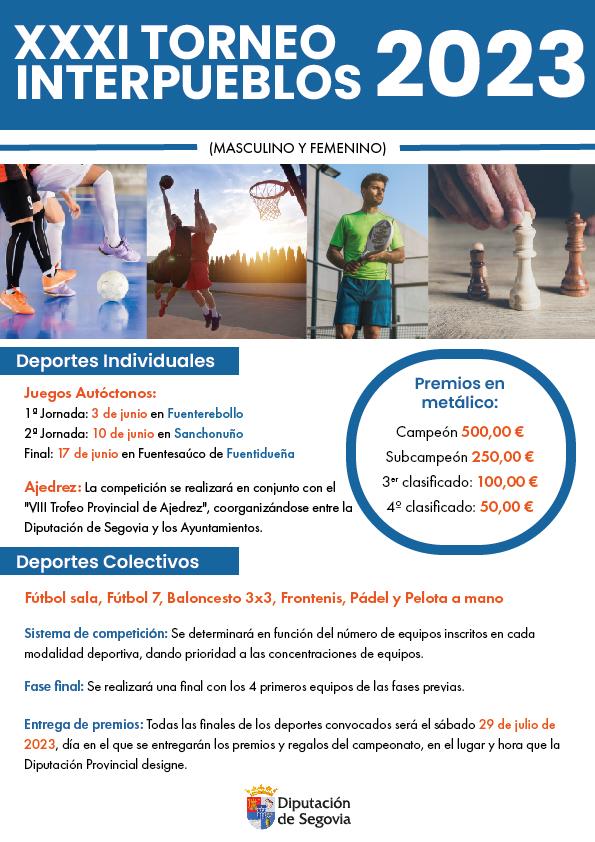 Por ello, con el objetivo de organizar la competición para este verano de 2023, la Unidad de Gestión y Promoción Deportiva ya ha puesto en marcha la trigésima primera edición del Torneo, que volverá a celebrarse en disciplinas individuales y colectivas, y cuyos interesados en participar deberán presentar sus solicitudes antes del 23 de mayo en los ayuntamientos a los que representen, tal y como establecen las bases de la convocatoria, disponibles en la página web de la institución provincial (https://www.dipsegovia.es/la-institucion/areas/cultura-juventud-y-deportes/deportes/torneo-interpueblos).