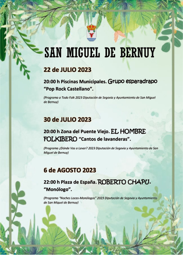 EVENTOS VERANO 2023 EVENTOS VERANO 2023 Eventos en San Miguel de Bernuy “Verano 2023”. Documentos VERANO 23.pdf (pdf 632,5 kB)