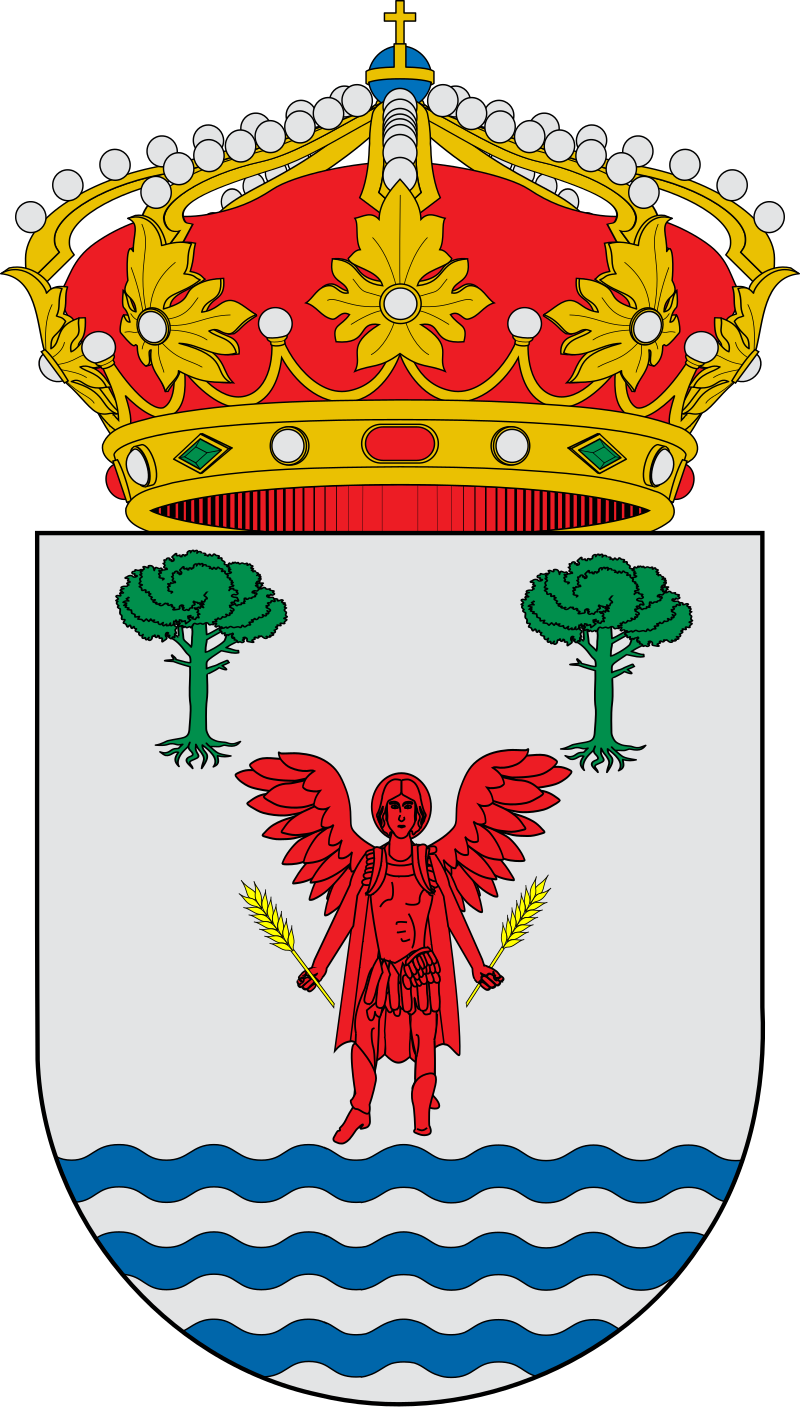 «De Plata, Arcángel San Miguel de gules, surmontado de dos pinos arrancados de sinople, en punta ondas de azur y plata. Vestido de gules, con una espiga de oro a la diestra y otra a la siniestra. Al timbre la corona real cerrada.»