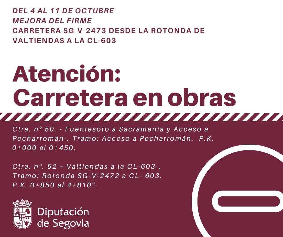 Las obras, que cuentan con una inversión de 153.000 euros, obligarán a cortar el paso a vehículos del 4 al 11 de octubre en el tramo entre la rotonda de intersección con la carretera SG-V-2472 y la CL-603, motivo por el cual el tráfico será desviado por las carreteras SG-241 y SG-V-2471.