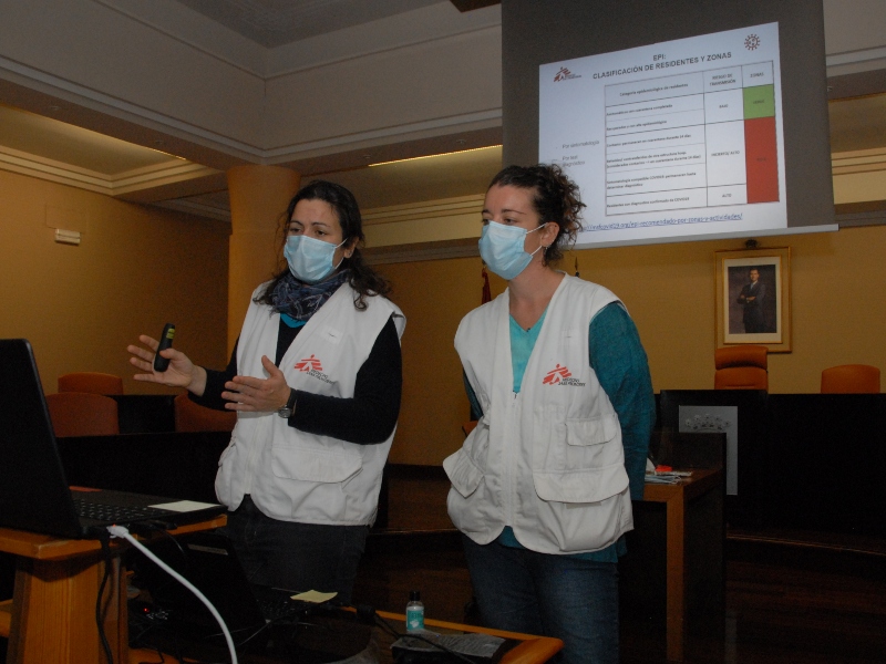 La ONG Médicos Sin Fronteras ha tenido gran presencia durante varias semanas en el Centro de Servicios Sociales, asesorando al equipo directivo en algunas de las tomas de decisiones que se han tenido que llevar a cabo con motivo de la incidencia de la pandemia y, su labor ha sido de gran ayuda para que la situación se haya podido controlar y los datos sean cada día más positivos. En esta línea de asesoramiento, surge esta formación que ha permitido a los participantes acercarse a la realidad del COVID19 conociendo las vías de transmisión, las medidas de seguridad que han de tomarse en cada escenario o datos más técnicos como la incidencia, la tasa de crecimiento, el índice de reproducción o el sistema de monitorización de los mortalidad diaria. En la parte más práctica, las dos especialistas han transmitido la falsa seguridad que pueden dar ciertos equipos de protección y el peligro que esto conlleva y han realizado demostraciones de cómo vestirse con ellos correctamente.