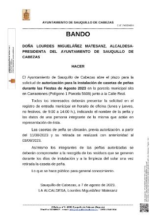 Apertura plazo para presentación de solicitud de autorización para la instalación de casetas de peñas en parcela municipal durante las Fiestas de Agosto 2023.