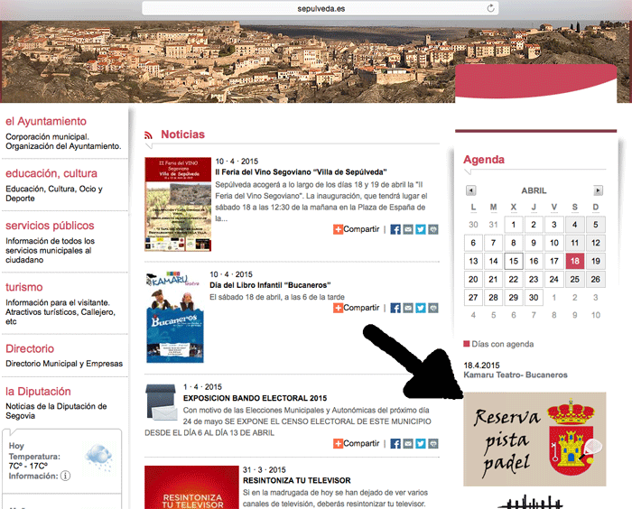 Para realizar las reservas de la pista de pádel online tiene que ir a la dirección web www.sepulveda.es/padel o pinchar en el banner que tiene a la derecha en la página de inicio de www.sepulveda.es (reserva pista de pádel).