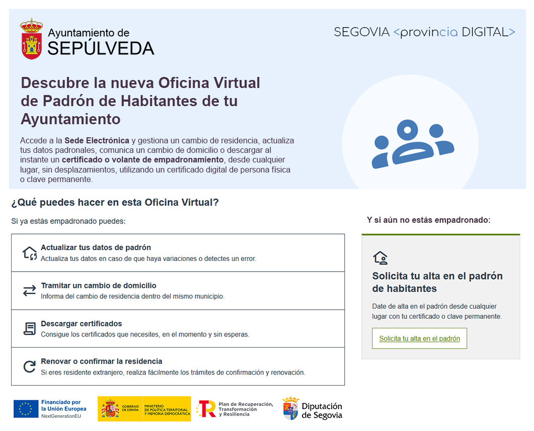 Iniciando sesión con certificado digital o cl@ve en la sede electrónica del Ayuntamiento de Sepúlveda, se podrán realizar diferentes trámites sin tener que ir presencialmente al Ayuntamiento: