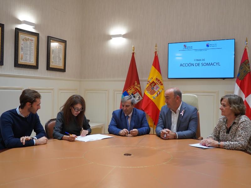 El presidente de la Diputación, Miguel Ángel de Vicente, y el delegado territorial de la Junta de Castilla y León en Segovia, José Luis Sanz Merino, han firmado la escritura pública de compraventa por parte de la institución para ser partícipe del accionariado SOMACYL dando así respuesta al acuerdo adoptado en la Junta de Gobierno de la Diputación del 24 de mayo de este año.