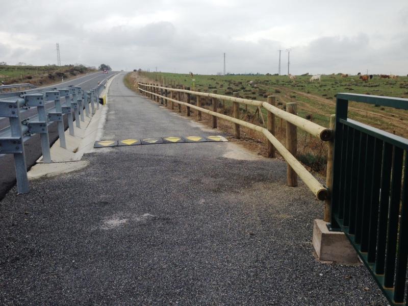 Por este motivo se han colocado en la zona de mayor desnivel de la carretera 150 metros de barandilla de madera, situados en el exterior del paseo y ubicados en dos tramos concretos, en el anterior al viaducto construido para salvar el Río Eresma y en el posterior al mismo. La barandilla ha sido construida con postes de pino tratados, unidos entre sí con herrajes de acero galvanizado.