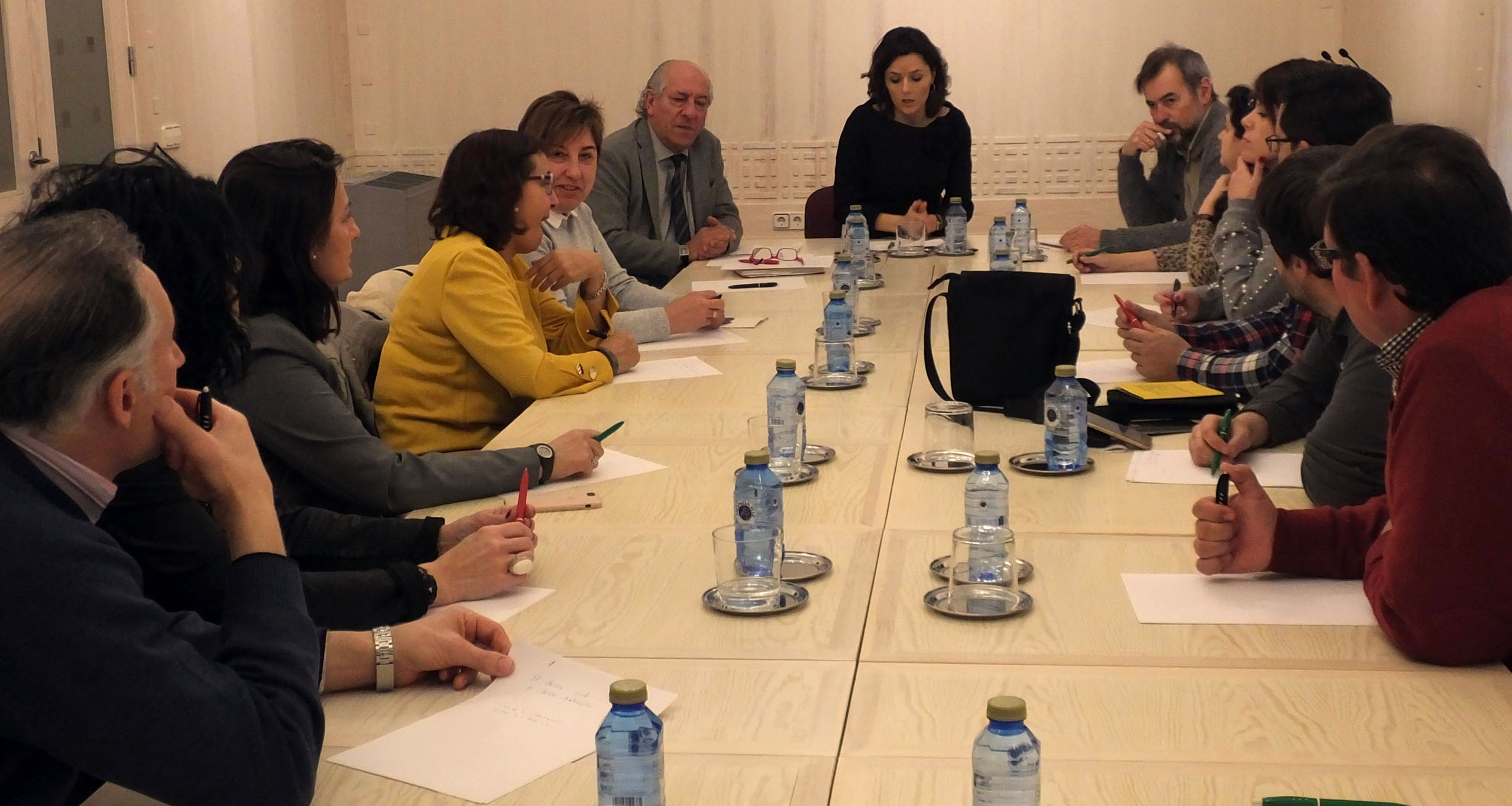 El Palacio Provincial ha acogido esta mañana una reunión entre la diputada del Área de Cultura y Juventud, Sara Dueñas, y la mayoría de los alcaldes y concejales de los municipios participantes en el programa ‘Aulas para Convivir Cantando', quienes, junto a algunos de los alumnos de este proyecto, habían mostrado la semana pasada su disconformidad con el modo de contratación del programa de cara al próximo año.