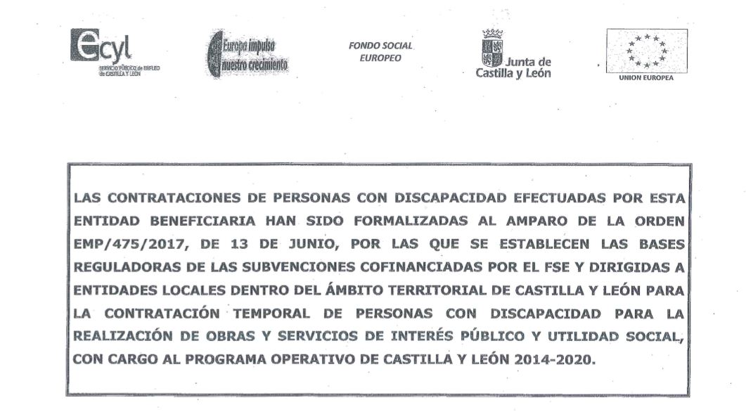 Por medio del presente anuncio se informa que el Ayuntamiento de Valseca ha procedido a la contratación de una persona con discapacidad para la realización de obras y servicios de interés público y utilidad social en virtud de la subvención concedida por el Servicio Público de Empleo de Castilla y León, la cual se encuentra cofinanciada por el Fondo Social Europeo.