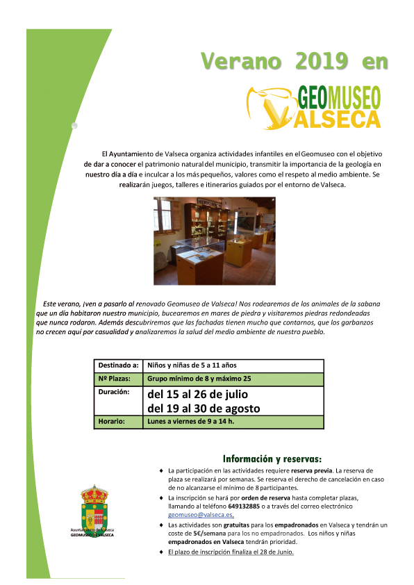 El Ayuntamiento de Valseca organiza actividades infantiles en el Geomuseo con el objetivo de dar a conocer el patrimonio natural del municipio, transmitir la importancia de la geología en nuestro día a día e inculcar a los más pequeños, valores como el respeto al medio ambiente. Se realizarán juegos, talleres e itinerarios guiados por el entorno de Valseca.