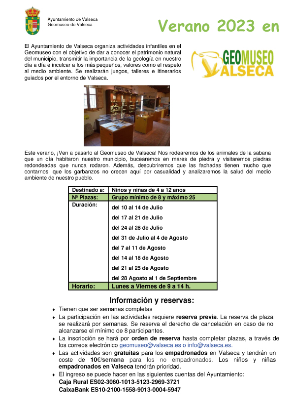 CAMPAMENTOS DE GEOLOGÍA Y ACTIVIDADES INFANTILES 2023 CAMPAMENTOS DE GEOLOGÍA Y ACTIVIDADES INFANTILES 2023 El Ayuntamiento de Valseca organiza actividades infantiles en el Geomuseo con el objetivo de dar a conocer el patrimonio natural del municipio. Documentos Valseca (2).pdf (pdf 82,7 kB)Autorización (1).pdf (pdf 58,1 kB)