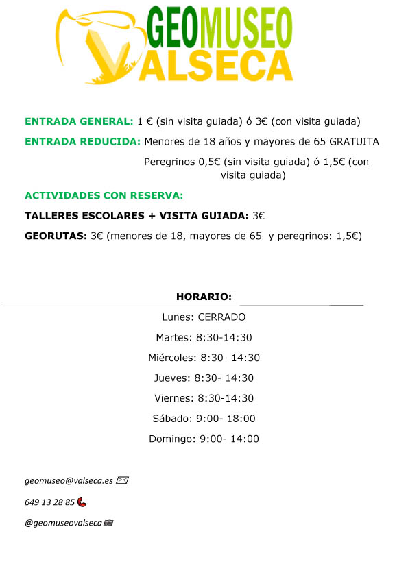 GEOMUSEO VALSECA. PRECIOS GEOMUSEO VALSECA. PRECIOS Visitas y actividades al Geomuseo de Valseca. Documentos precios.pdf (pdf 152,4 kB)