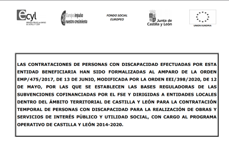 Con cargo a subvención, cofinanciada por el FONDO SOCIAL EUROPEO, destinada exclusivamente a la contratación temporal de personas con discapacidad...