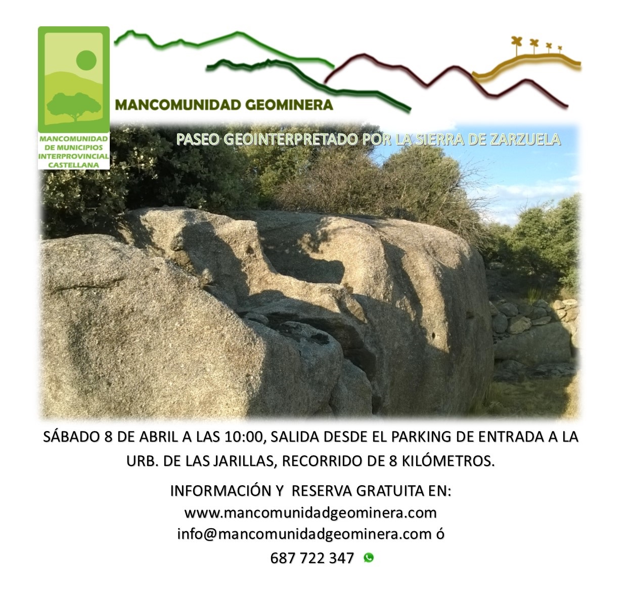El sábado 8 de abril, tendrá lugar una ruta por la sierra de Zarzuela del Monte, la salida será desde el parking de entrada de la urbanización las Jarillas, recorrido 8 kilómetros. Mas información y reserva en el cartel adjunto