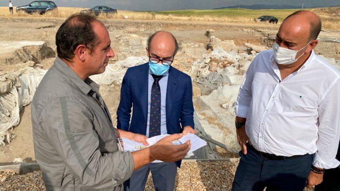 El consejero y el presidente estuvieron guiados en la visita por el director del proyecto de excavación y prospección arqueológica, Santiago Martínez Caballero, que con un equipo técnico de la Universidad de Salamanca han indagado este verano en el conjunto de estancias, y avanzado en la zona de servicios del sector suroccidental de la ciudad y sus Termas de Fortuna. También siguen definiendo el perímetro del edificio, que según las investigaciones, pudo tener uso desde el siglo II d. C. hasta, al menos, el siglo IV d. C.