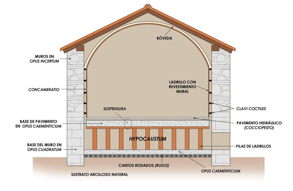 Desde la sala con mosaico se accedía también a las estancias calefactadas. Estas son dos y ambas cuentan con hypocaustum. El horno situado a los pies del caldarium servía para generar aire caliente que circulaba bajo el suelo a través de unas cámaras subterráneas, en los espacios entre las pilas de ladrillos (pilae) que soportaban los pavimentos. El hypocaustum del caldarium y el del tepidarium estaban comunicados, de este modo el aire caliente del horno pasaba el primer lugar a la sala de baños caliente (caldarium) y luego a la sala de baños templados (tepidarium). Sobre las pilae de ladrillo se colocaba la suspensura para apoyar el pavimento, en primer lugar se disponían unos grandes ladrillos sobre los que se vertía una capa de opus caementicium y por último el pavimento que iba a servir como superficie de tránsito, "cocciopesto" (pavimento hidráulico) en el tepidarium y losas de piedra en el caldarium.
