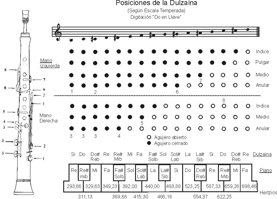 Según estos postulados la Tabla de Posiciones de la dulzaina es la que figura seguidamente. Los puntos negros indican agujeros tapados, los ceros agujeros abiertos y los números las llaves que deben actuarse.
