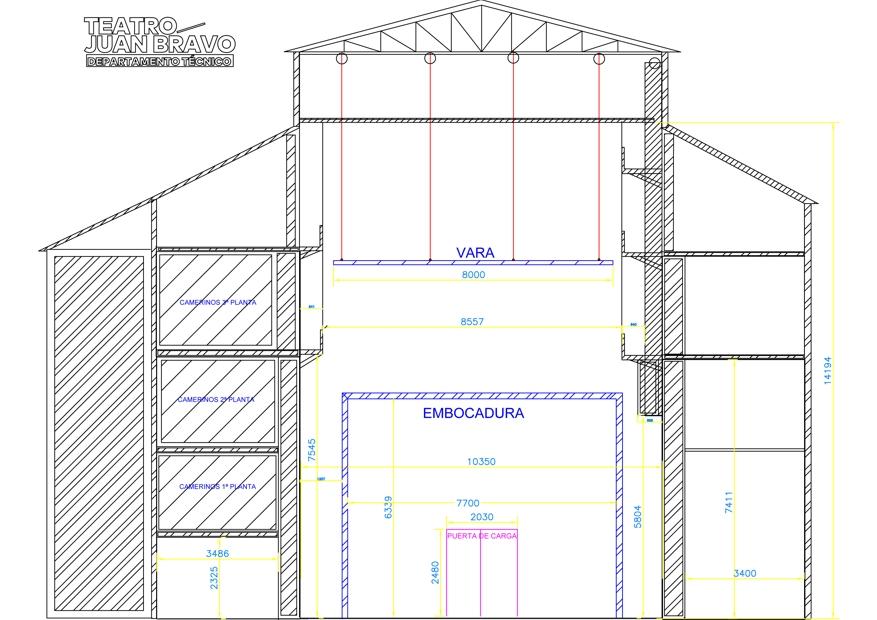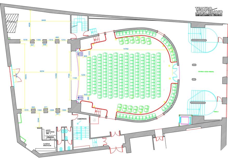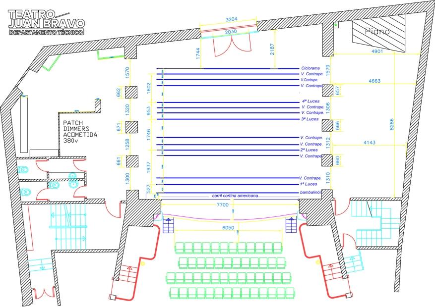 - 2 Escaleras de acceso del Patio de Butacas al Escenario, no centradas, en cada lado del escenario.